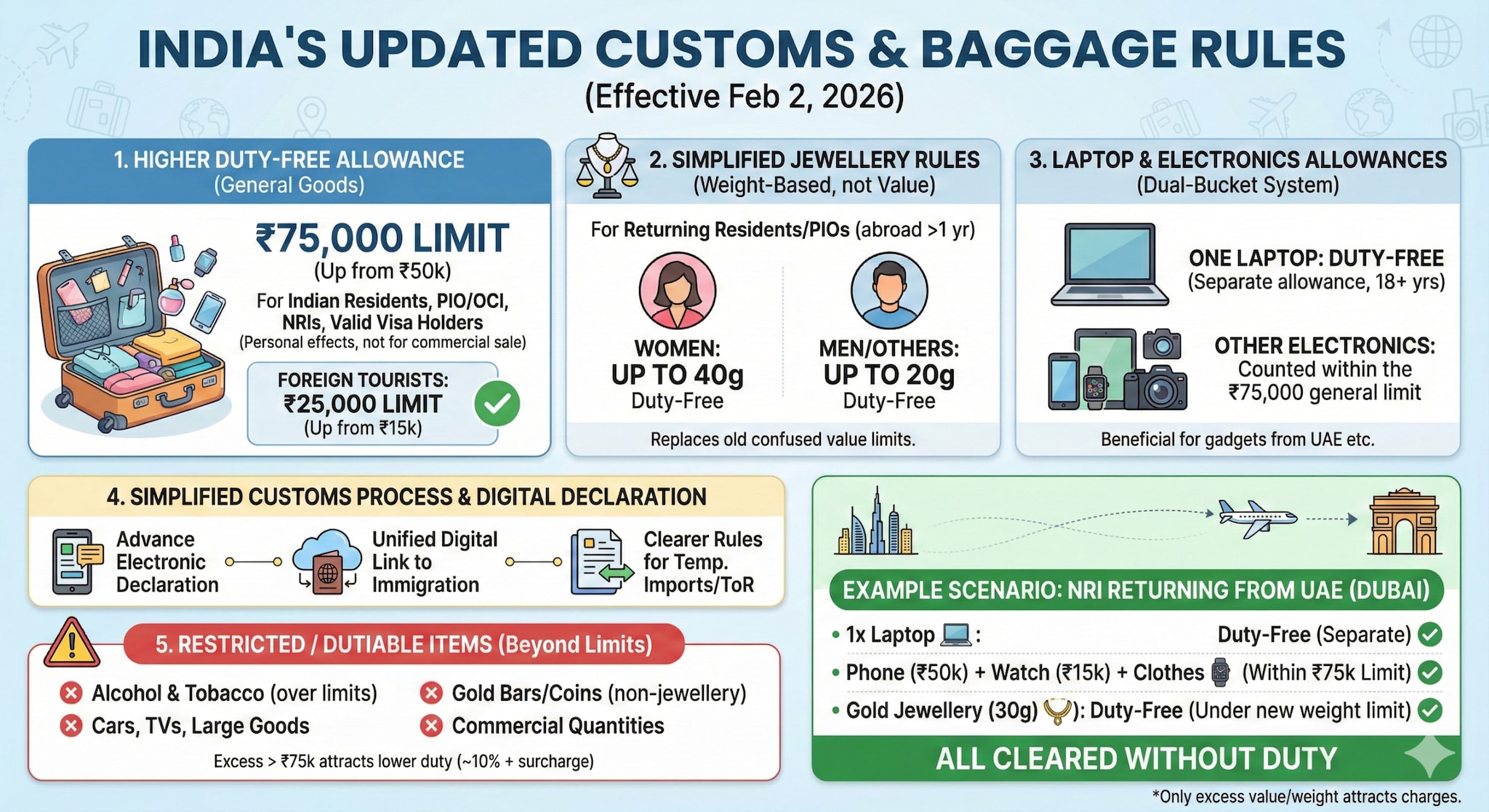 India has updated its customs and baggage rules affecting what international passengers, including people arriving from the UAE, can bring into the country without paying duty. These changes are part of the Baggage Rules, 2026, and the Customs Baggage (Declaration & Processing) Regulations, 2026, which came into effect from February 2, 2026, following announcements in the Union Budget 2026.
